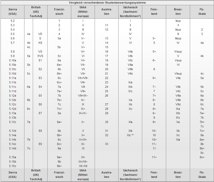 Klettern Schwierigkeitsgrade Skalen Umrechnen Vergleichen