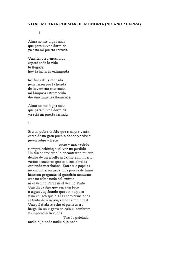 Nicanor parra poemas del alma. Diario de tu cuerpo III Hugo Gutiérrez Vega Oda al presente Pablo Neruda Belleza del astrónomo Vicente Quirarte socratismo Humberto Mello ULTIMO BRINDIS Nicanor Parra Ver métrica. Accede a una de las mayores bolsas de Empleo en España y encuentra la profesión que buscas. Y tus caprichos no acepto.
